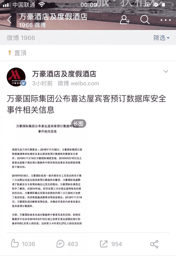 11月30日,万豪国际集团发布公告,称旗下的喜达屋集团的客户预订数据库发生信息泄露,最多可涉及5亿名全球宾客的个人信息。据万豪国际集团表示,这次泄露至少可以追溯到2014年9月喜达屋被万豪收购之前,并一直持续到今年9月。本次用户数据遭窃事件也成为了自雅虎宣布大约30亿用户的信息被窃以来规模最大的一次。