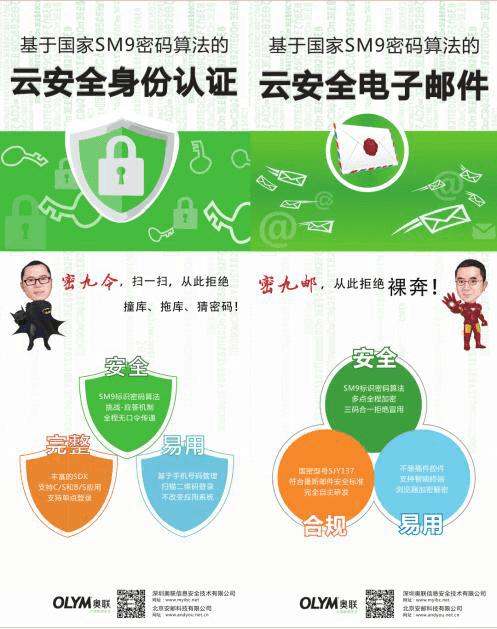 在本届数博会上,奥联主打推出基于SM9算法的安全电子邮件系统“密九邮”,和 “扫一扫,从此不怕撞库、拖库、猜密码”的“密九令”,获得了相关参会机构、企业、从业者的高度关注和认可。这两款安全产品着手解决了目前大数据时代最为严峻的邮件泄密和用户敏感信息泄漏难题。其中,安全邮件已在全国政协、全国人大、国家信息中心、国家发改委、中国信息安全测评中心、国家信息安全技术研究中心、中国石油、用友等政府机关机构及企事业单位成功应用。