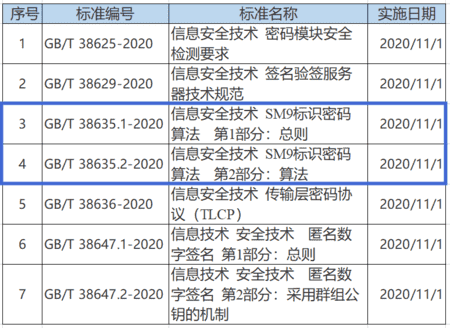 4月28日,GB/T 38635.1-2020《信息安全技术 SM9标识密码算法 第1部分:总则》、GB/T 38635.2-2020《信息安全技术 SM9标识密码算法 第2部分:算法》两项国家标准获批发布,SM9算法正式成为国家标准。