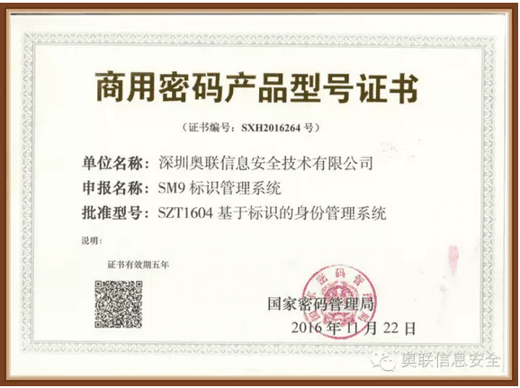 22019年3月,奥联自主研发的“联合签名系统、密码模块软件(Android版)、密码模块软件(iOS版)”获得了国家密码管理局商用密码产品型号证书,是目前国内第一款同时支持SM2和SM9的密码模块软件。截止至2018年12月,中国网民规模达8.29亿,其中手机网民规模达8.17亿,网民通过手机接入互联网的比例高达98.6%。 随着移动应用的广泛使用,如移动政务、移动办公、移动支付、移动商务、车联网、物联网等都需要安全、高效的电子签名技术实现身份认证。由于手机等移动智能终端使用USB等硬件安全介质不便,这就急需密码技术厂商研发符合国密安全技术要求的产品,在移动终端上实现密钥的安全存储和安全使用。