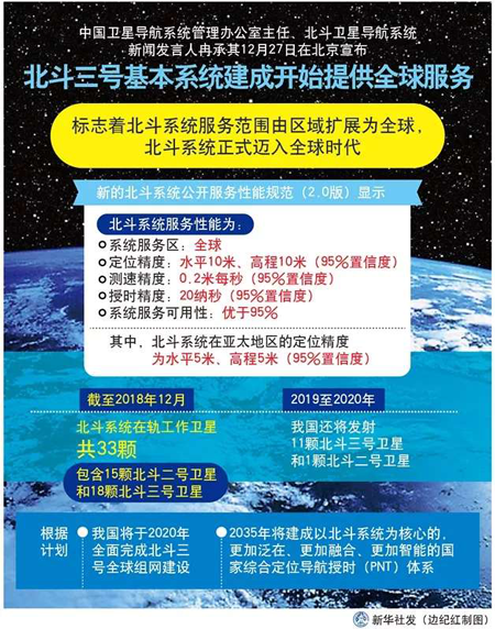在12月27日举行的国务院新闻办公室新闻发布会上,中国卫星导航系统管理办公室主任、北斗卫星导航系统新闻发言人冉承其宣布:北斗三号基本系统完成建设,于今日开始提供全球服务。这标志着北斗系统服务范围由区域扩展为全球,北斗系统正式迈入全球时代。据介绍,北斗系统是中国自主建设、独立运行,与世界其他卫星导航系统兼容共用的全球卫星导航系统,可在全球范围,全天候、全天时,为各类用户提供高精度、高可靠的定位、导航、授时服务。